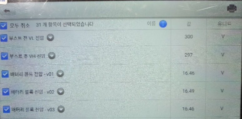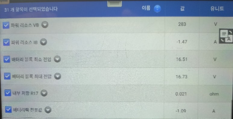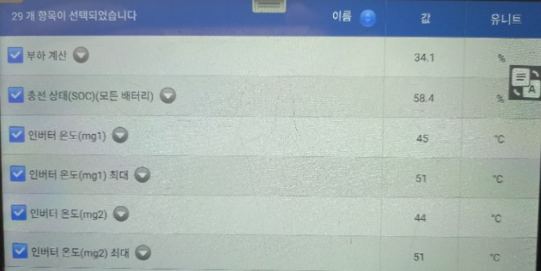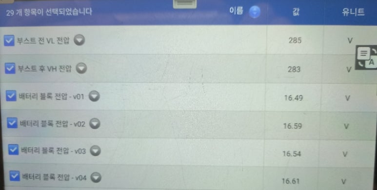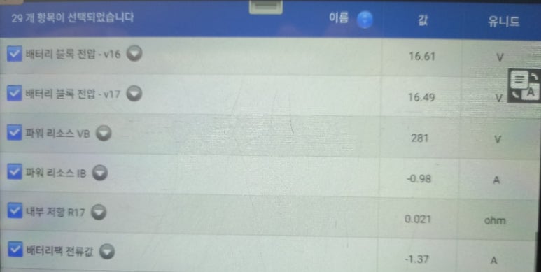 고전압배터리에 대한 관련 스캐너상 표출되는 수치들을 작동 상황에 따라 관찰하면서 4가지 관점에서 고전압배터리가 제대로 작동하고 있는지에 대해 확인 작업을 거쳐야 합니다. 이렇게 확인 진단 작업이 생략되면, 정식 서비스센터에서 신품으로 고전압배터리팩을 교체한다고 할지라도 2년에서 4년 사이에 다시 경고등이 들어올 가능성이 아주 큽니다.