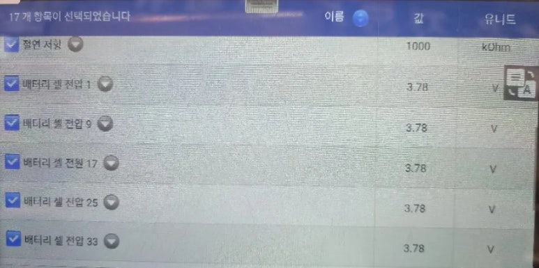 최신 기술로 엄선된 신품 수준으로 거듭난 리빌딩 하이브리드 고전압배터리팩의 전압 수치 데이터를 보면 3.78볼트로 일정한 신품 수준의 배터리 밸런싱 상태를 한 눈으로 확인할 수 있으며, 작동상황별로 테스트를 거친다고 해도 하이브리드리 배터리팩을 구성하는 모든 모듈들은 일정한 밸런싱 전압 상태를 유지하고 있다는 것을 아주 쉽게 알 수 있는 데이터들입니다. 정확한 리빌딩 기술로 신품 수준으로 거듭난 하이브리드 배터리팩은 어떤 작동 상황 속에서도 밸런싱이 아주 잘 유지되고 있음을 알 수 있습니다.