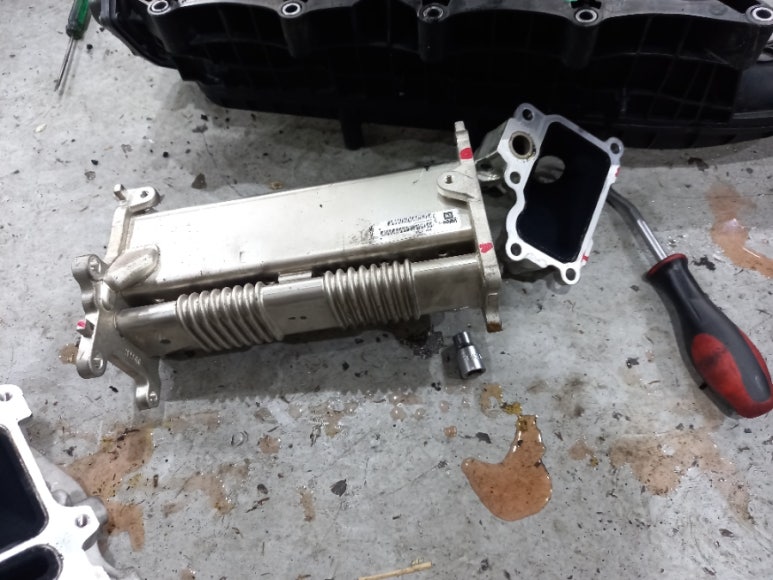 재순환되는 배기가스의 온도를 낮추는 장치이며, 카본과 오염물질이 쌓여 냉각 효율 저하 및 엔진 성능 저하 증상이 발생됩니다.