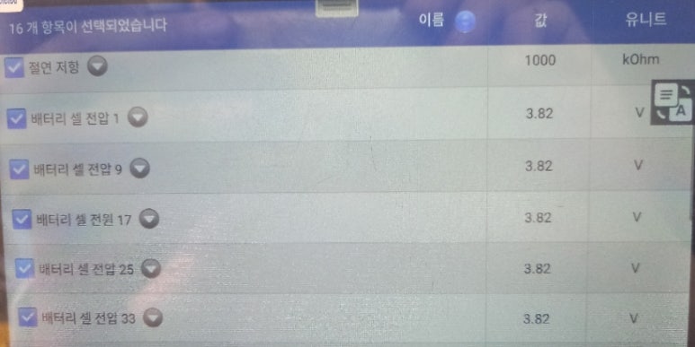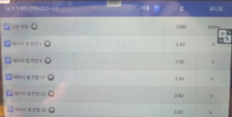 저희 업체의 전매특허인 고전압배터리 모듈별 셀간 전압 편차가 0.00볼트로 신차 수준임을 단번에 확인할 수 있는 내용입니다. 시스템 작동 상황 속에서도 0.02볼트로 현대기아차 매뉴얼 기준을 벗어나지 않는 하이브리드 배터리 수준 증명하고 있습니다.
