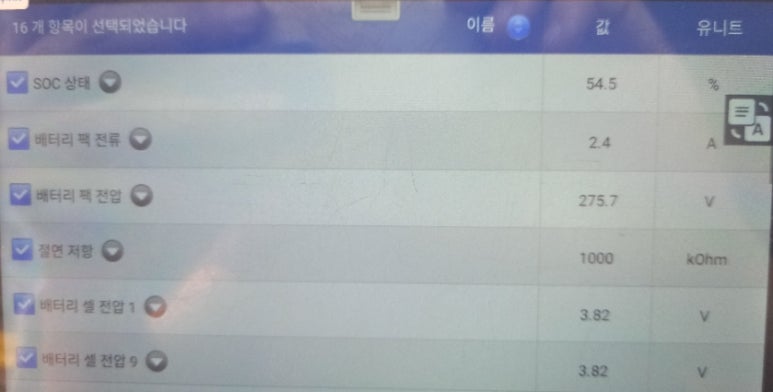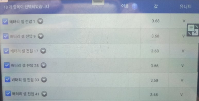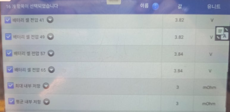 과부하 테스트를 거친 후의 하이브리드 고전압배터리 상태를 살펴보면 셀간 전압편차는 0.02볼트 이내로 유지되고 있었으며, 현대기아차 매뉴얼상 정상 셀간 전압편차인 0.02볼트 수준으로 유지되는 것을 보면 신품 수준의 하이브리드 배터리라는 것을 입증할 수 있는 데이터입니다. 해당 과부하 테스트를 거친 후에도 새롭게 신푼 수준으로 리빌딩된 배터리의 상태는 셀간 전압 편차가 아래와 같이 0.00볼트임을 알 수 있습니다.