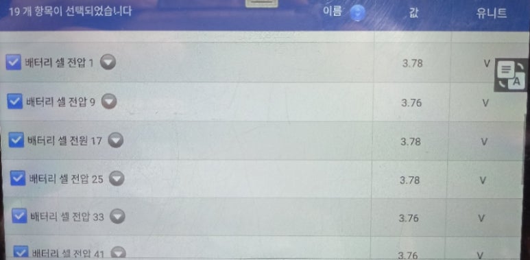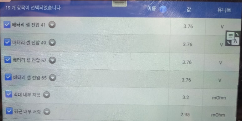 교체된 후 셀전압 이상 증상까지 해결한 후 과부하 테스트를 재확인한 하이브리드 고전압배터리 데이터입니다. 3.76볼트 및 3.78볼트로 과부하 테스트 후에도 현대기아 매뉴얼상 기준을 단번에 밸런싱되는 모습을 확인 할 수 있었습니다. 빠른 시간에 원인 파악 및 보정작업이 가능한 하이브리드 고전압배터리 교체 업체를 선택하는 것이 중요합니다. 가격적인 측면으로 여러분의 안전과 바꾸지 마시기 바랍니다.