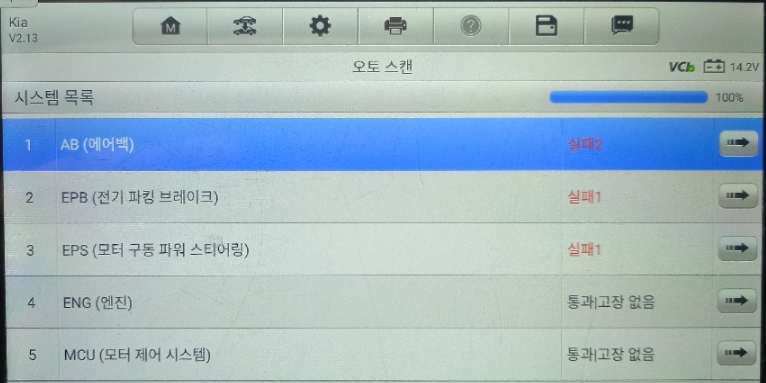 에어백, 전기 파킹 브레이크, 모터 구동 파워 스티어링 3가지 카테고리에서 4가지 에러코드를 표출하고 있지만 해당 에러코드들은 현재 해당 차량에 발생하는 이상 증상과 무관하며, 간접적으로도 연관성이 없었습니다. 이런 케이스나 스캐너상 에러코드가 없는 차량의 진단은 일반적인 차량의 진단 시간보다 긴 시간을 요구하게 됩니다.