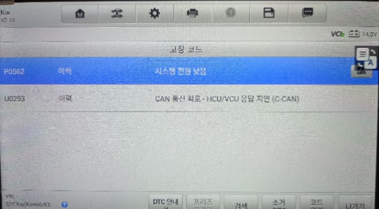 P0562 시스템 전원 낮음 에러코드의 경우 시스템 전원이 낮아 일시적으로 표출되는 에러코드이며, 확인만 하고 문제가 없다면 신경을 쓰지 않아도 되는 에러코드입니다. 시스템 방전 상황에서 표출되는 문제로 일반적으로 문제라고 볼 수 없는 내용입니다. U0293 CAN 통신 회로 HCU/VCU 응답 지연 (C-CAN) 에러코드가 문제인 경우입니다. 일시적인 표출일 가능성이 크며, 정밀진단 후 확진을 내려야할 문제입니다.
