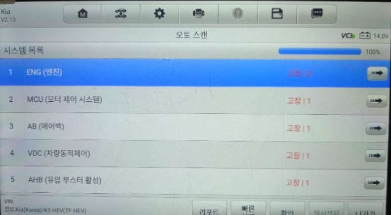5가지 스캐너상 카테고리에서 에러코드들을 표출하고 있으며, 해당 에러코드들에 대한 원인 분석 및 영구적인 또는 일시적인 에러코드들로 분류하여 정밀진단을 해야 합니다. 하이브리드 특성상 에러코드들의 신뢰도가 낮은 편이라 있는 그대로 받아들이면 안됩니다. 또한 에러코드가 표출되지 않는 부분들까지 염두하고 정밀진단에 임해야 합니다.