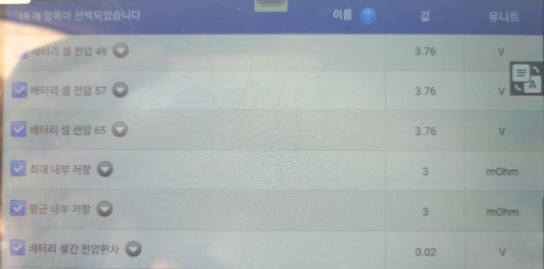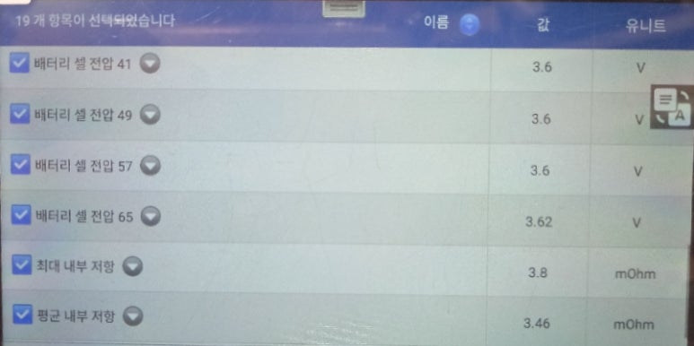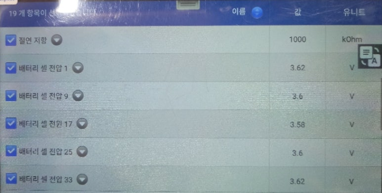 아이들링 시에 확보되는 데이터들을 분석해보면 큰 문제점은 없어 보이는 차량입니다. 셀간 전압편차 수준은 0.04볼트에서 0.06볼트로 정상적인 수준을 보이는 차량이었습니다. 전화 상담을 하다보면 일부 잘못된 인터넷 정보를 보고 아는 척을 하는 분들이 많았습니다. 현대기아차 고전압배터리 셀간 전압 편차가 0.02볼트가 넘어서면 고전압배터리에 문제가 있다는 잘못된 정보를 언급하면서 고전압배터리팩에 문제가 있다는 이야기를 하는데, 이는 고전압배터리 특성을 모르는 정보이므로 참고 조차 하지 마시기 바랍니다.
