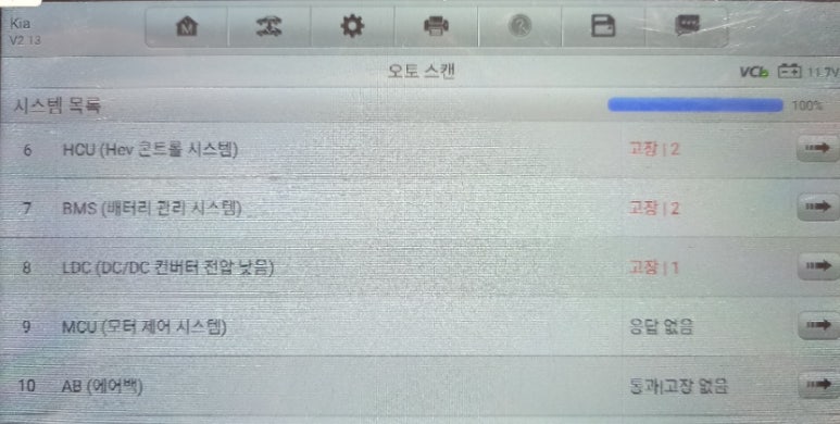 에러코드가 발생하고 있는 카테고리가 8개로 나타나지만 감각이 있는 사람이라면 MCU(Motor Control Unit) 카테고리가 응답없음 으로 표출되고 있다는 점을 인지하는 것도 아주 중요합니다. 응답없음 상황은 MCU(Motor Control Unit) 시스템 기판 손상이 가능한데, 인버터 부품에서 쇼트가 나면서 MCU기판을 태워 작동 불능상태를 만들기도 합니다.