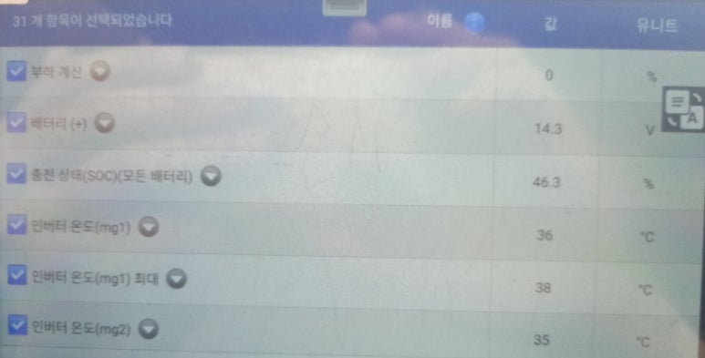 해당 데이터를 보면 '체크 하이브리드 시스템' 경고등이 계기판에 들어오면 하이브리드 배터리팩을 전혀 사용하지 않는 것은 아닙니다. 최소한의 작동만하며 크루즈컨트롤 기능이 되지 않습니다. 위 데이터 수치만 봐도 노하우가 있다면 계기판 '체크 하이브리드 시스템' 경고등이 들어온 것을 쉽게 알 수 있습니다. 인버터 문제점도 어느 정도 알 수 있는 데이터도 있다는 것을 알 수 있습니다.