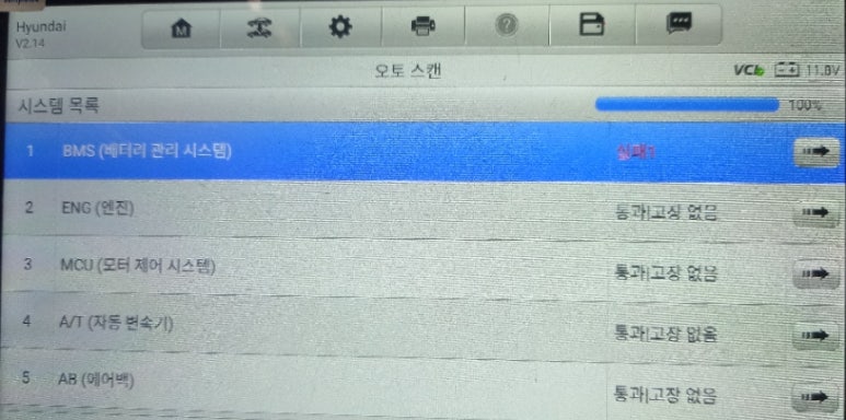 정밀진단를 위한 기초 작업인 스캐너 에러코드 검색 결과 해당 차량은 진단 시점에 1가지 카테고리에서 에러코드들을 표출하고 있는 차량이었습니다. BMS 카테고리에서 에러코드들을 표출하는 상황이었습니다.