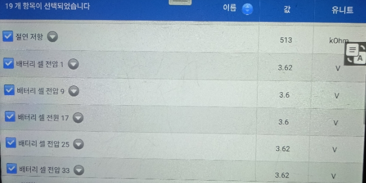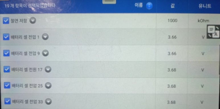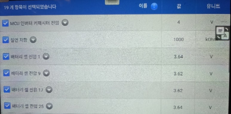 교체 후에 배터리 셀간 전압 편차를 확인하는 것을 시작으로 교체 후 진단 작업을 통해 기본적인 확인 작업을 시작하게 됩니다. 이를 바탕으로 조건 및 작동 상태에 따른 변화값을 확인하면서 추후 발생될 수 있는 문제점들을 최대한 확인을 하면서 교체 작업 후 차량 상태를 확인하게 됩니다.
