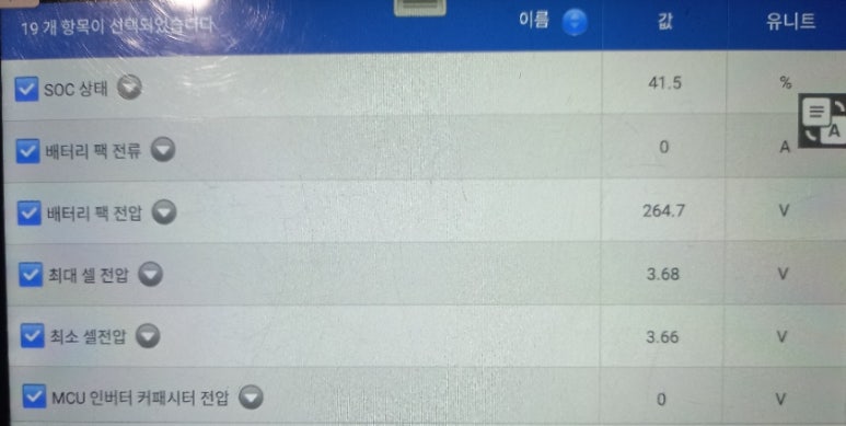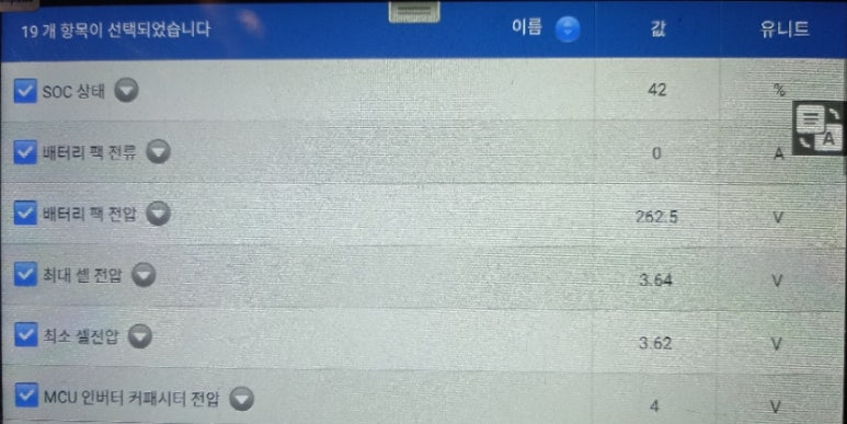 그리고 키온 상태에서 점검해야할 내용 중에서 배터리와 상관관계를 확인할 수 있는 데이터 수치를 확인할 수 있었습니다. 해당 데이터와 함께 배터리 상태 또는 하이브리드 시스템 상태를 확인할 수 있습니다. 이런 기초 데이터를 확보하여 데이터를 분석하는 것이 올바른 하이브리드 및 전기차 진단 방법입니다.