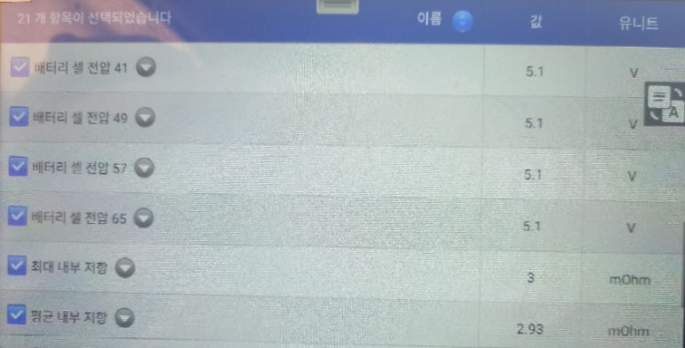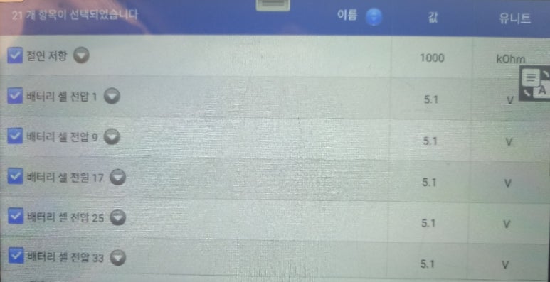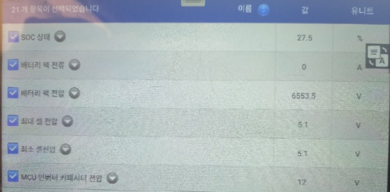 배터리 팩 전압은 6553.5볼트이며, 최대 셀전압 및 최소 셀전압이 5.1볼트입니다. 정말 말도 안되는 상황입니다. 우선 배터리 팩전압이 6553.5볼트라면 72개셀로 구성된 배터리 팩이므로 한 개 셀전압은 91볼트가 되어야 하는데, 최대 셀전압 및 최소 셀전압이 5.1볼트라는 것도 말도 안되는 상황이며, 최대 셀전압 및 최소 셀전압이 5.1볼트라면 72개셀로 구성된 배터리팩 전압은 367.2볼트가 나와야 정상입니다. 배터리 팩 전압은 6553.5볼트이고, 셀전압이 5.1볼트 기준으로 계산한다면 배터리팩 전압은 367.2볼트이어야 하는데, 정말 아이러니한 데이터 수치입니다.