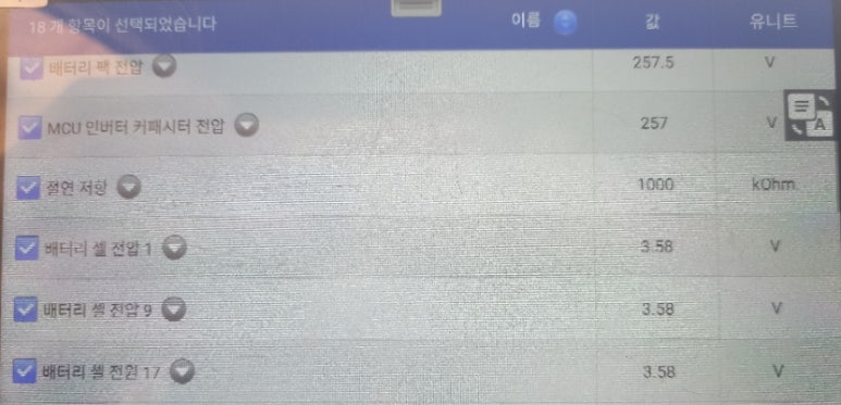 고전압 배터리팩에 대한 센싱이 정확하게 이루어지는지에 대한 내용 확인과 수치들이 정확한지 기본적으로 정밀 진단을 시작합니다. 교체된 고전압 배터리팩의 전압 편차는 전혀 없는 0볼트로 고전압 배터리팩을 구성하는 셀전압 모두 3.58볼트를 표출하고 있습니다. 신품 수준의 전압 편차 0볼트의 리빌딩 고전압 배터리팩만을 국내에 유통시키는 것을 원칙으로 합니다.