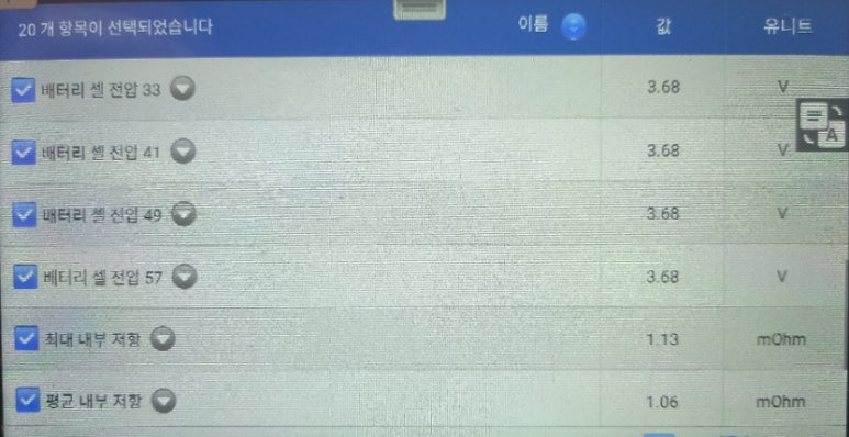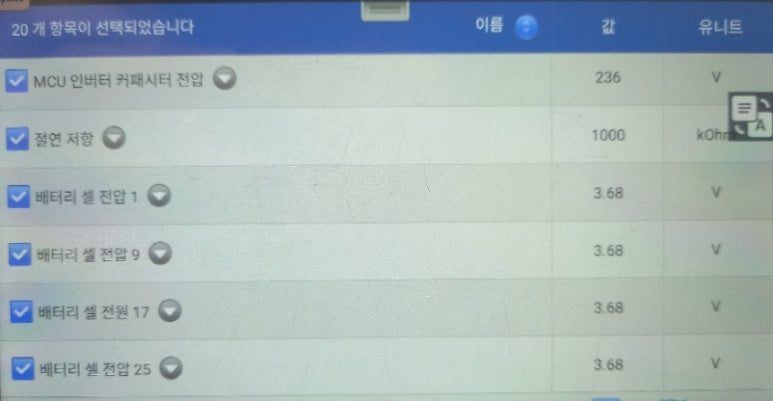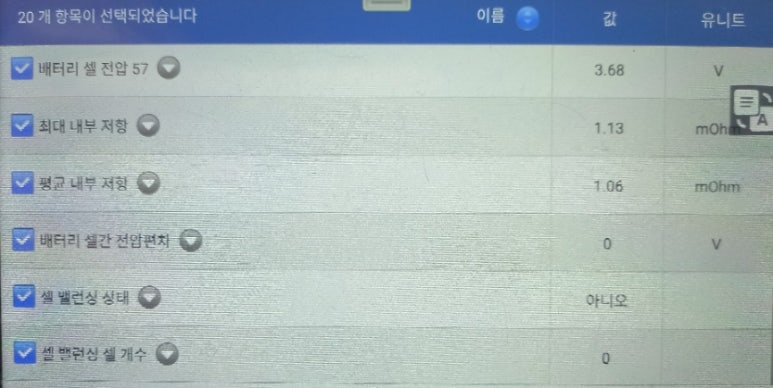 하이브리드 고전압배터리 데이터를 확인해보면 우선 아이들링 상황에서 3.68볼트로 셀간 전압 편차는 0.00볼트로 아직 전압 밸런싱을 안정적으로 유지하고 있었습니다. 물론 아이들링 상황 데이터만으로 하이브리드 고전압배터리 건강 상태를 확진할 수 없지만 아이들링 데이터 상황만 보더라도 큰 문제는 없어 보입니다.