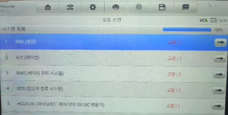 정밀진단 결과 해당 차량은 수리 가능 차량이었으며, 해당 차량은 진단 시점에 5가지 카테고리에서 에러코드들을 표출하고 있는 차량이었습니다. ENG AB BMS OCS HCU LDC 카테고리에서 표출하는 에러코드는 하이브리드 시스템을 컨트롤하는 부품 이상으로 인한 일시적인 표출 상황이었으며, 해당 차량의 핵심 에러코드 카테고리는 BMS 및 HCU 카테고리이었으며, 다른 카테고리에 동시에 트러블코드가 표출될 경우 경험과 노하우로 예상되는 진단 범위가 먼저 생각나게 됩니다. 해당 내용들을 검토한 결과 하이브리드 고전압시스템에 대한 문제점을 실측 진단을 해야 합니다.