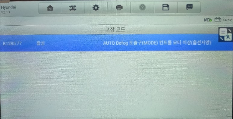 에어컨에 남아있는 B1285 AUTO Delog 토출구 MODE 컨트롤 모터 이상 에러코드의 경우 해당 부품을 교환해야 DTC코드가 발생되지 않지만 에어컨 작동에는 문제가 없기 때문에 그냥 두기로 차주 분과 협의하여 수리를 하지 않은 에러코드입니다.