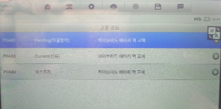 하이브리드 컨트롤 Hybrid Control 카테고리에 진입하여 고장코드에 진입하면 Replace hybrid battery pack 즉, 하이브리드 배터리팩 교체라는 에러코드가 P0A80 코드로 표출하는데, 3개로 표출하고 있습니다. Pending Currunt 히스토리 3가지 부카테고리로 표출됩니다. 만약 4개가 표출될 경우 서비스센터에서는 BMS 고장으로 설명하고 고전압배터리 교체 비용을 제외하고 BMS 교체비용을 추가로 안내합니다.