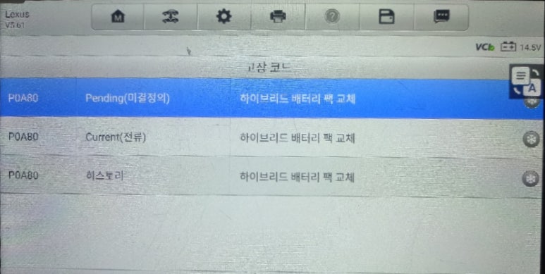 하이브리드 컨트롤 Hybrid Control 카테고리에 진입하여 고장코드에 진입하면 Replace hybrid battery pack 즉, 하이브리드 배터리팩 교체라는 에러코드가 P0A80 코드로 표출하는데, 3개로 표출하고 있습니다. Pending Currunt 히스토리 3가지 부카테고리로 표출됩니다. 만약 4개가 표출될 경우 서비스센터에서는 BMS 고장으로 설명하고 고전압배터리 교체 비용을 제외하고 BMS 교체비용을 추가로 안내합니다.