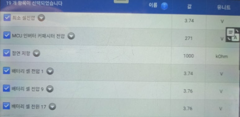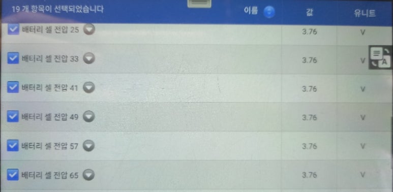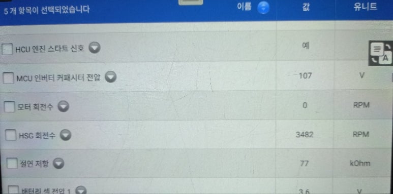HSG 회전수에 따라 변동되는 데이터 수치를 찾는 것도 중요합니다. 그리고 셀 전압 변동 상황도 확인을 하여 데이터 수치들을 종합적으로 취합하여 상황별 데이터를 확보한 후 확진에 필요한 근거를 찾아 결론을 내릴 수 있어야 하이브리드 전기차 전문정비사라 할 수 있습니다. 해당 차량의 셀전압은 위 데이터만 보면 3.60볼트를 유지하는 것을 알 수 있습니다. 하이브리드 고전압배터리를 전압 수치 하나 가지고 진단을 내릴 수 있으면 얼마나 좋겠습니까만 해당 차량의 하이브리드 고전압배터리는 전압 수치는 정상이며, 하이브리드 배터리를 진단하는 다른 관점 원인으로 문제가 발생한 것입니다.