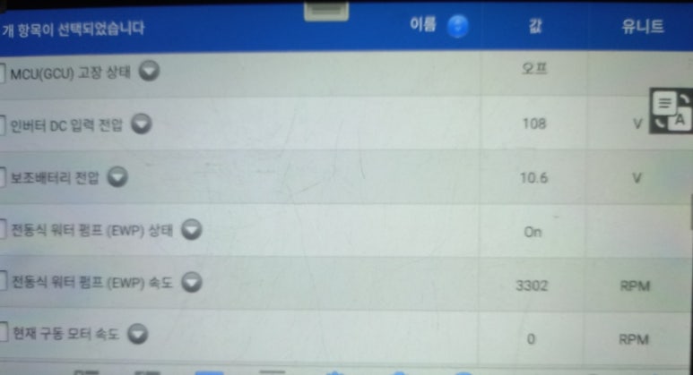 위 데이터에서는 하나만 언급한다면 보조배터리 전압입니다. 여기서 보조배터리는 시동배터리르 의미하며 10.6볼트를 유지하고 있습니다. 시동을 켜지 않고 키온 상태에서 전압이 10.6볼트라면 시동배터리 자체를 진단해야 합니다. 하지만 해당 차량의 경우 시동을 켠 상태에서 하이브리드 시스템을 점검하세요 경고등이 표출될 때만 보조배터리 전압이 14.2볼트 정도에서 10.6볼트 수준으로 낮아지는 증상이며, 해당 데이터 수치로 고장 확인 진단을 해야 하는 부품이 있었으나 해당 부품은 문제 없는 것으로 판정되었습니다.
