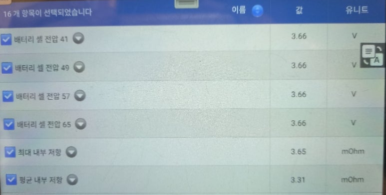 중고 하이브리드 고전압배터리의 경우 셀간 전압 편차는 무조건 0.04볼트에서 0.08볼트 수준임을 알 수 있지만 여러 작동 상황 후에도 해당 하이브리드 고전압배터리 셀전압들은 3.66볼트로 일정한 수준으로 안정적인 상태임을 한번에 확인할 수 있습니다. 하이브리드 고전압배터리 특성을 제대로 알고 리빌딩한 하이브리드 고전압배터리팩을 사용하는 것은 신품 하이브리드 고전압배터리으로 교환하는 것보다 경제적이고, 안정적이라는 점을 위 데이터에서 알 수 있습니다.