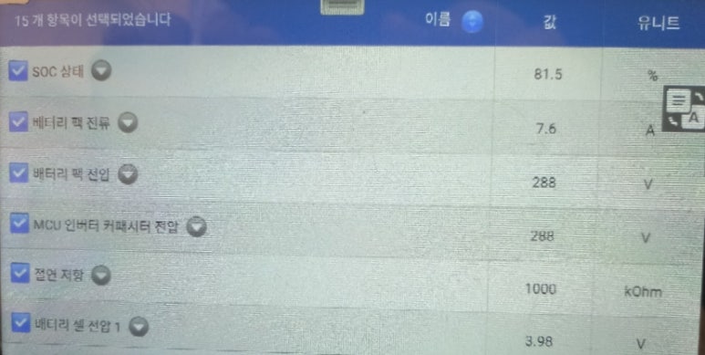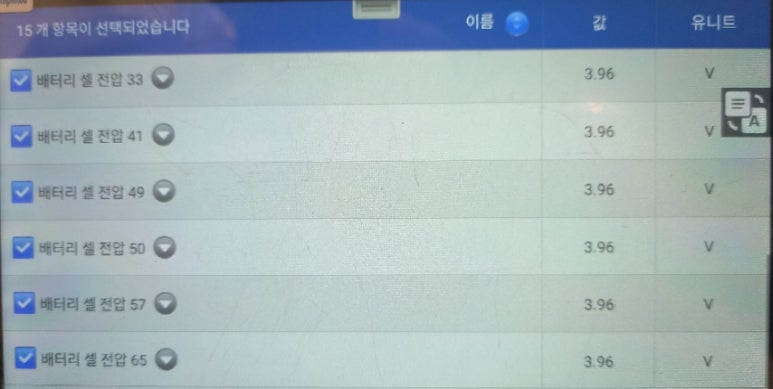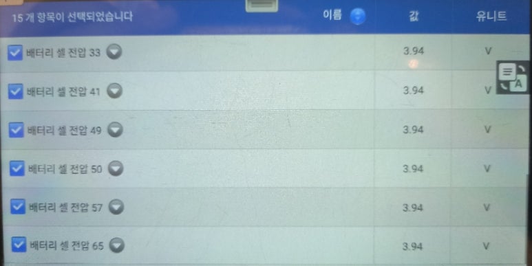 다시 과부하 테스트를 거친 후 하이브리드 고전압배터리 데이터를 보면 3.96볼트로 일정한 셀간 전압편차를 보이고 있다는 점을 알 수 있습니다. 여러 상황을 보더라고 새롭게 장착된 하이브리드 고전압배터리 상태가 신품 수준으로 작동하고 있다는 점을 알 수 있습니다.
