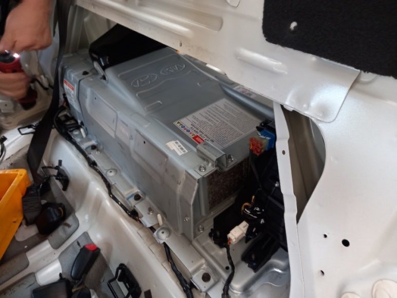 문제점을 정밀진단을 통하여 판단하고, 수리 범위와 견적 내용을 차주 분에게 알려드린 후에 확인 받은 후 작업을 시작하게 됩니다. 하이브리드 배터리팩 핵심인 하이브리드 배터리 모듈을 전부 탈거한 사진입니다. 우측에 보이는 것은 릴레이 박스와 배터리 제어부입니다.