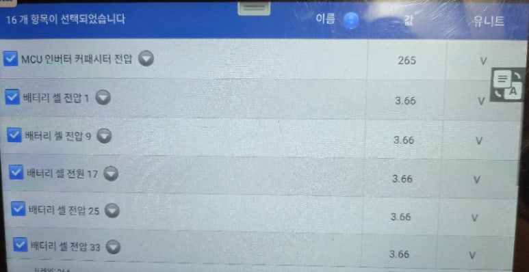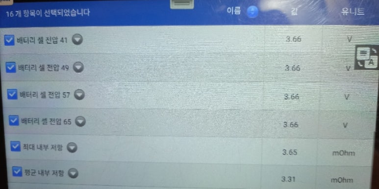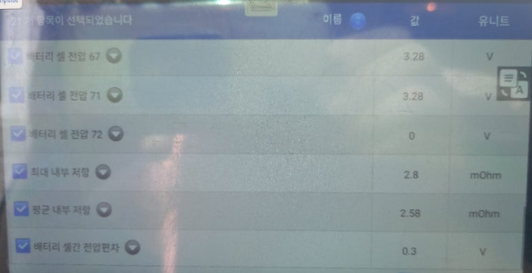 배터리셀간 전압 편차는 0.30볼트 수준으로 현대기아차 매뉴얼상 기준치인 0.02볼트의 15배 수준으로 심각한 상황이었습니다. 배터리셀간 전압 편차의 경우 0.00볼트를 제외한 전압이 나오는 배터리셀간 전압만 놓고 최대셀전압과 최소 셀전압 편차를 계산하여 데이터로 제공하므로 전체 셀 점검 후에 편차를 놓고 판단해야 합니다.