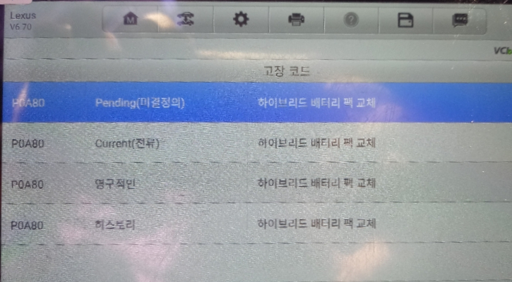 해당 에러코드가 4가지으로 Pending Currunt 영구적인 히스토리 로 표출되고 있습니다. 일반적인 상황에서는 영구적인 에러코드를 제외한 Pending Currunt 히스토리 3가지만 표출되는 것이 일반적이며 3가지 에러코드 표출 상황에서는 대부분 하이브리드 배터리팩 단독 문제인 경우가 많습니다. 영구적인 에러코드의 경우 경고등이 삭제된 이후에도 남아있게 되는데, 장기적인 정상 작동 상황이 계속될 경우 자동 삭제가 됩니다.