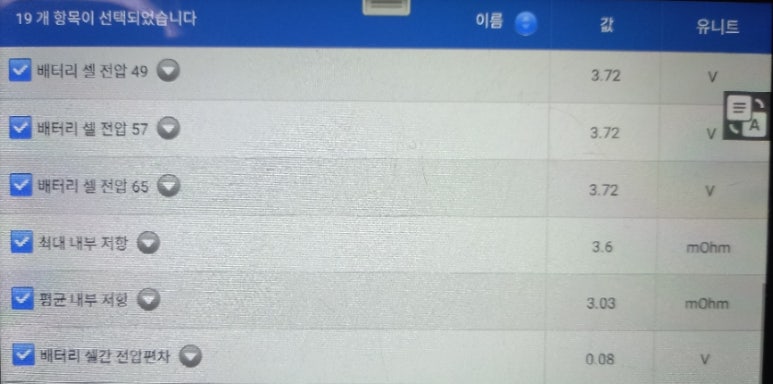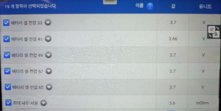 그리고 데이터상 셀전압들을 정리해보면 3.60볼트부터 3.72볼트까지 확인고 있었으니 데이터상 실제 셀간 전압편차는 0.12볼트이지만 제어부상 판단하고 있는 셀간 전압편차는 0.08볼트로 실제 데이터보다 낮은 수준으로 잘못 파악하고 있었습니다. 이 원인은 제어부 노후화로 인한 손상이 원인으로 추정됩니다.