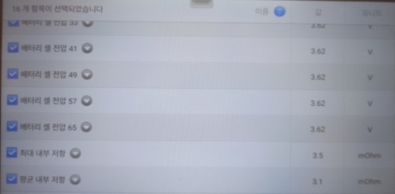 하이브리드 배터리를 교체한 후에 작동 데이터를 살펴보면 셀간 전압편차는 0.00볼트로 모든 셀전압이 3.62볼트로 유지되고 있음을 알 수 있습니다. 하이브리드 전기차 배터리는 전압 밸런싱이 중요하며 가장 기초적인 상식입니다. 배터리 전압 편차가 크게 유지되는 상황이 계속 유지될 경우 작동 효율이 떨어져 출력 및 연비 저하 현상이 나타나게 되며, 하이브리드 전기차 시스템 작동에 악영향을 미쳐 부품 고장을 유발할 수 있기 때문입니다.