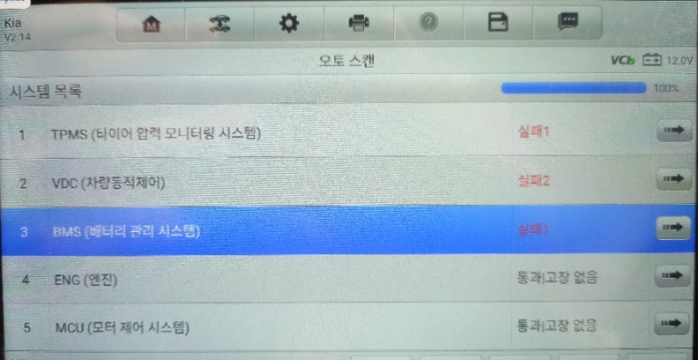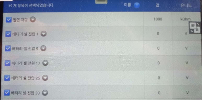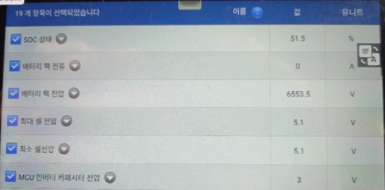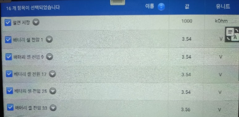 해당 차량의 경우 진단기 에러코드에 의존한 진단을 할 경우 진단 자체를 전혀할 수 없을 정도로 에러코드 하나만 있는 상황입니다. 이에 진단 장비를 통해 각 배터리 셀의 전압, 전류, 온도, 내부 저항 값 등을을 비롯하여 상황적 데이터까지 실시간으로 모니터링하여 특정 셀의 불균형이나 이상 징후를 파악합니다. 특히 셀 간 전압 편차가 크거나 내부 저항이 높은 셀이 발견되면 스웰링의 가능성이 높습니다. 그리고 배터리셀에 대한 진단 뿐만 아니라 차량 전반의 상황을 데이터로 진단 가능해야 합니다.